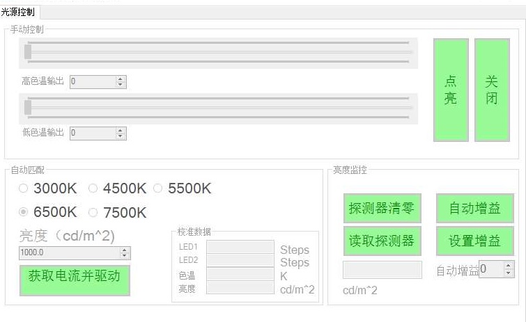 系統(tǒng)軟件界面如下圖。軟件界面比較直觀,可以手動(dòng)調(diào)節(jié) LED 的電流大小,在界面上就是光標(biāo)的位置,越往右代表電流越高,亮度越高。