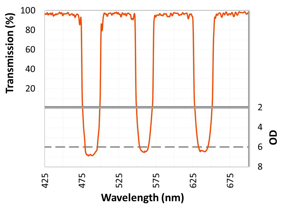 ULTRA系列多陷波濾光片可以設(shè)計成在帶之間具有比OD8更大的截至深度,**的截至陡度和高達(dá)98%的透過率。它們非常適用于需要同時阻斷多條激光線的應(yīng)用,拉曼濾光片。